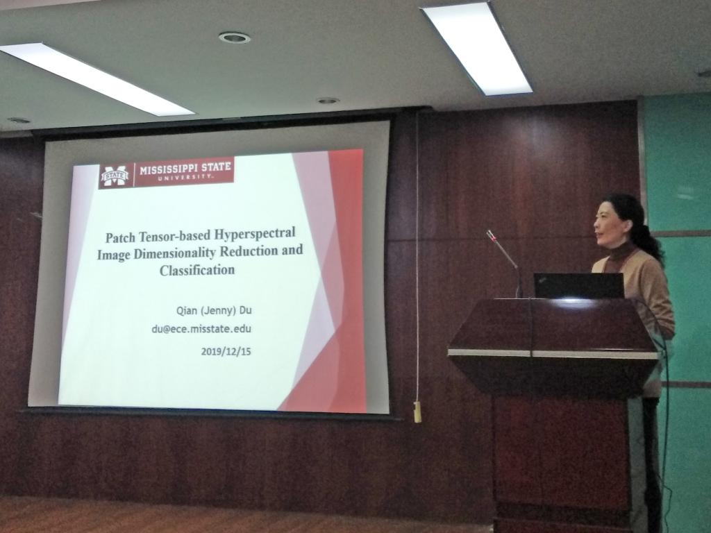 (通讯员 刘慧泽)12月16日下午,应地空学院熊熊院长与吴柯副院长邀请,美国密西西比州立大学电子与计算机工程学院Qian Du教授做客我院,并在物探楼222学术报告厅做了“Patch Tensor-based Hyperspectral Image Dimensionality Reduction and Classification”的学术报告,全校40多位师生到场聆听讲座。