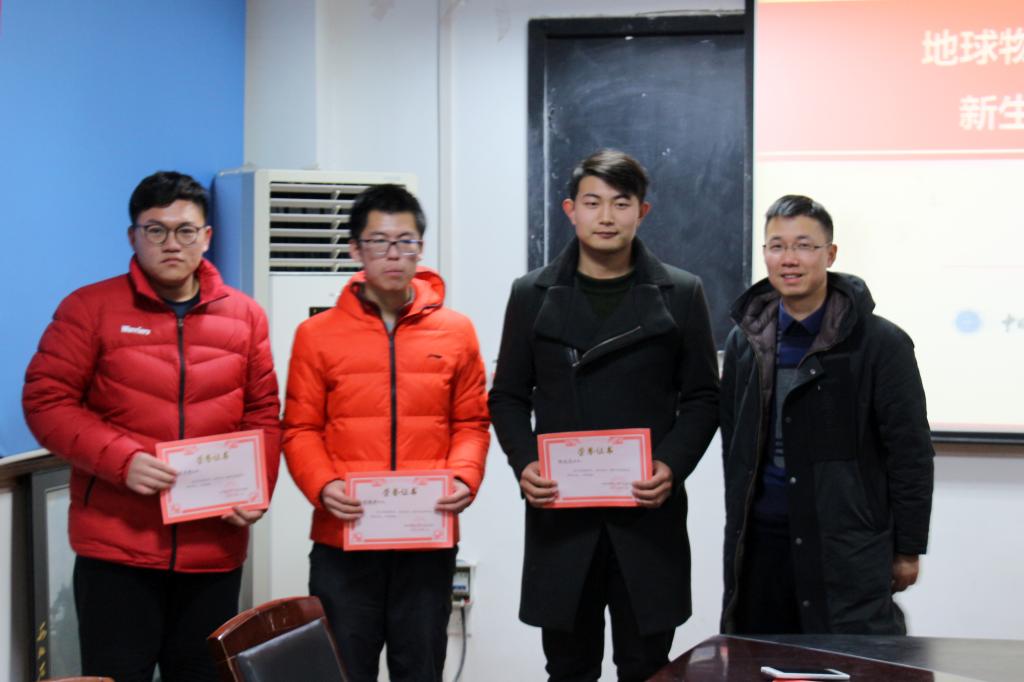 (通讯员张川  摄影祁阳阳)2018年1月5日下午,地空学院在物探楼214召开2017级新生入学奖学金颁奖仪式。武汉中仪物联技术股份有限公司董事长郑洪标、学院党委副书记李周波,辅导员张川、祁阳阳,2017级各班班长、团支书以及10名获奖新生参会。