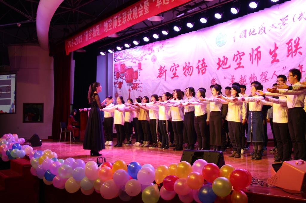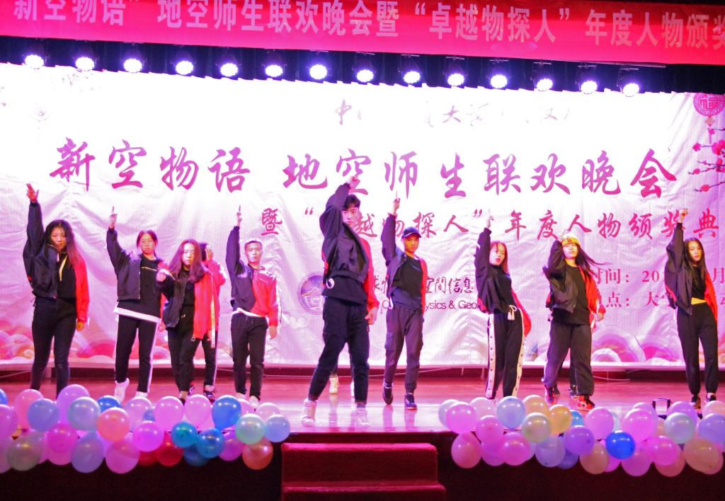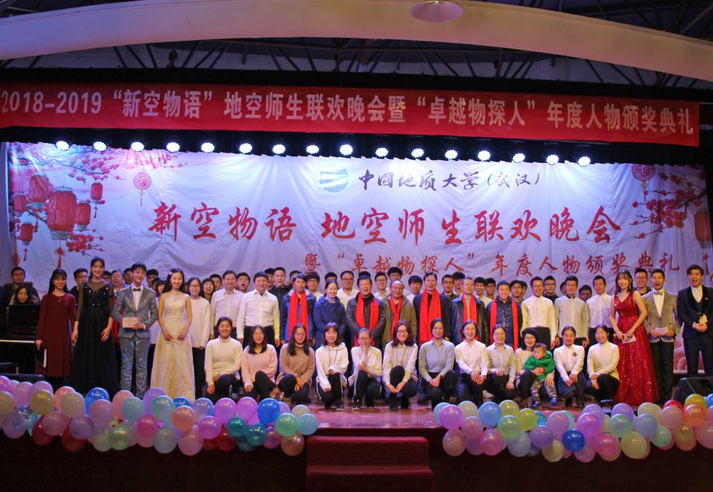 1月2日晚7点,地空学院“新空物语”师生迎新年联欢晚会暨“卓越物探人”年度人物颁奖典礼在大学生活动中心二楼举行。学院全体班子成员、就业创业指导处副处长陈慧、学院教师与全院同学一同观看晚会,喜迎2019年新年。