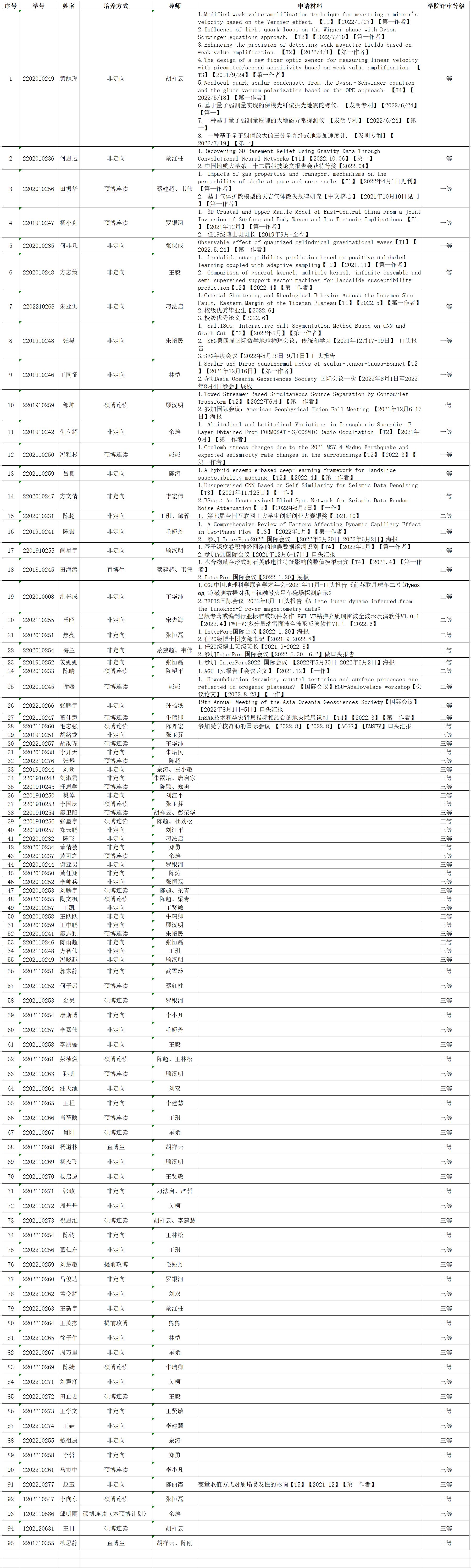 根据《地空学院关于2022-2023学年博士研究生奖助学金评选的通知》要求,经个人申报、班级审核工作组审核、前期材料公示及学院评审组评审,现将地空学院2022-2023年度博士研究生奖助学金推荐名单进行公示: